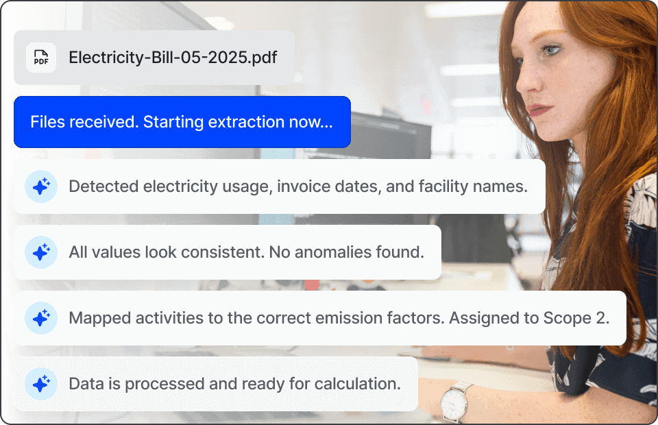Drop in invoices or PDFs — your AI Agent instantly extracts the right carbon data. No formatting, no manual entry.